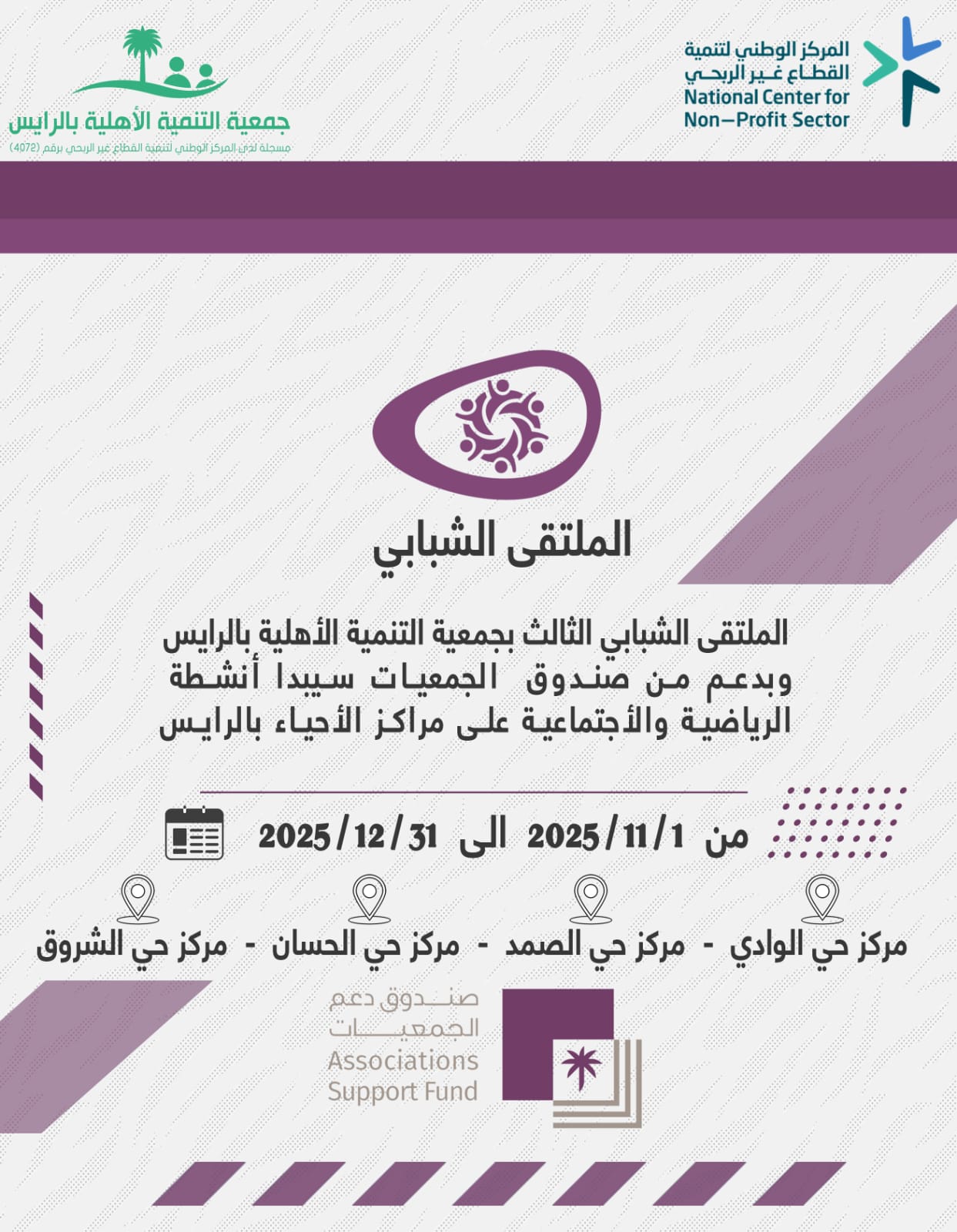 اعتمد صندوق دعم الجمعيات دعم مشروع الملتقى الشبابي الثالث لهذا العام بمبلغ (160000) ألف ريال واعتمد كذلك منحة رأس المال البشري بمبلغ (48000)ريال
